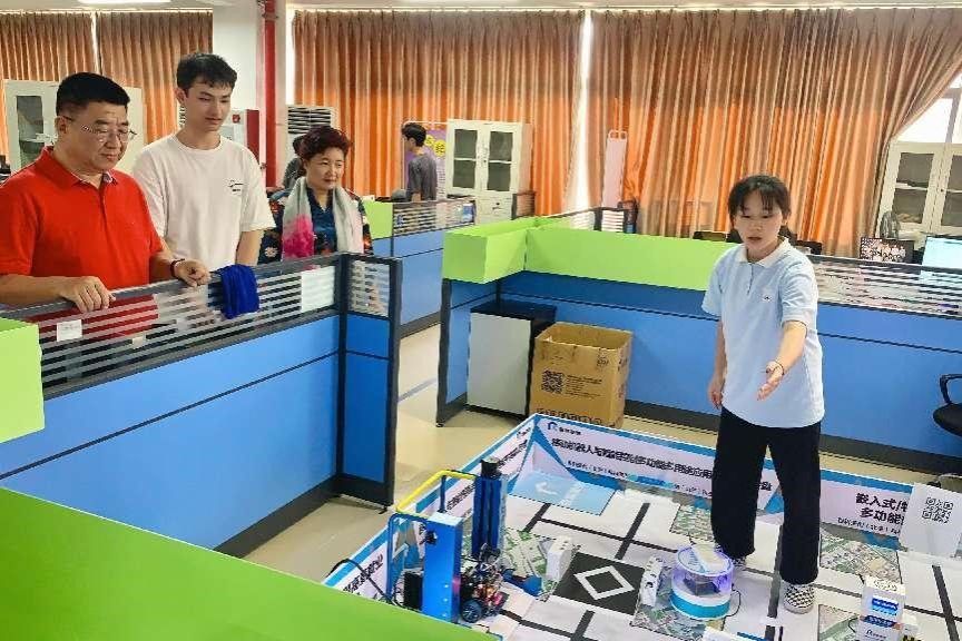 校领导实地查看了创新研发区、项目孵化区、创业交流区、创业大赛路演区及校企合作区。工程技术学院技能大师工作室项目团队在嵌入式系统应用开发沙盘展示了智能机器自动识别交通标志物作业的全过程。