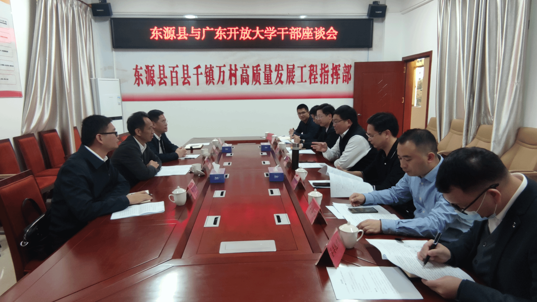 调研期间,谢锦群一行与东源县委书记秦卫民,县委常委、常务副县长赖建军,县委常委、统战部部长郑远程以及东源县“百千万工程”指挥办、广东工业大学驻东源县服务队队长等就结对共建进行了深入交流探讨。座谈会上,秦卫民介绍了东源县“百千万工程”总体情况以及东源县职业教育发展情况,对广东工业大学和广东开放大学选派驻县服务队与东源县结对共建表示衷心感谢。秦卫民指出,东源县把“百千万工程”作为本县高质量发展的重要工程,东源县委、县政府将加强东源县与我校在产业发展、职业教育、开放教育、文旅发展等领域的共建帮扶,推动“双百行动”落地见效。