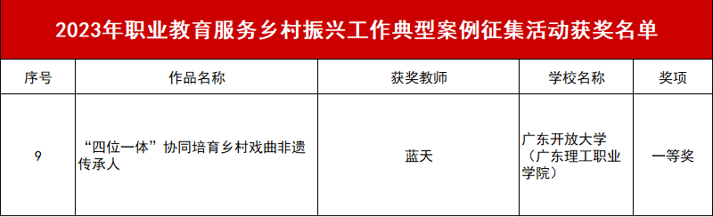 近日,2023年职业教育服务乡村振兴工作典型案例征集活动获奖名单公布。其中,学校文化传播与设计学院院长、教授蓝天申报的《“四位一体”协同培育乡村戏曲非遗传承人》案例荣获一等奖。