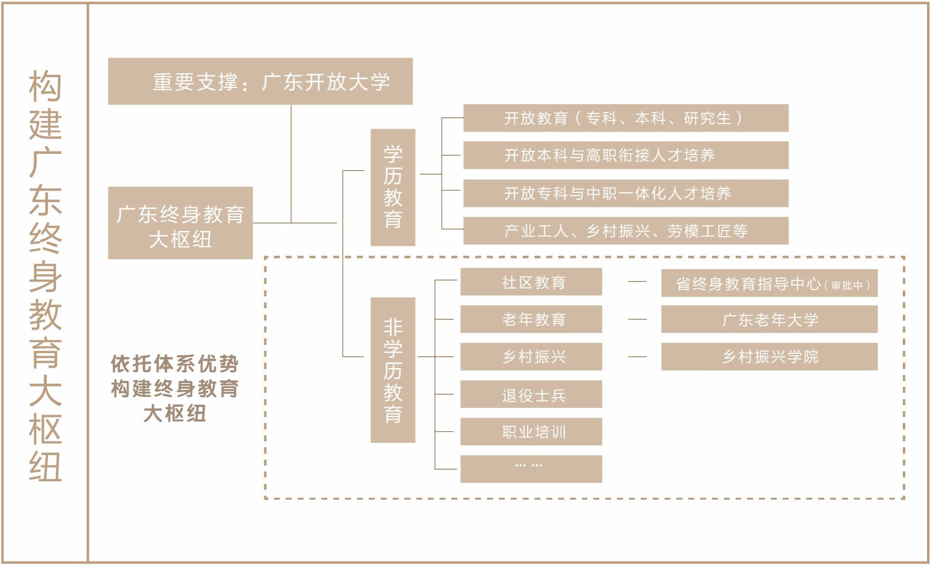 学校秉持“开放多元、有教无类”办学理念,依托全省开放大学办学体系,坚持学历教育和非学历教育并举,入选广东高等教育“冲一流、补短板、强特色”提升计划和省域高水平高职院校建设计划建设,努力构建广东终身教育大枢纽。