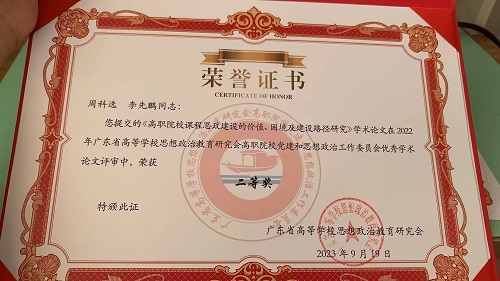 其中,学校经济管理学院教师周科选、李先鹏提交的《高职院校课程思政建设的价值、困境及建设路径研究》荣获优秀学术论文二等奖;马克思主义学院教师李晓春提交的《新时代高校青年马克思主义者培养的路径优化》荣获优秀学术论文三等奖。