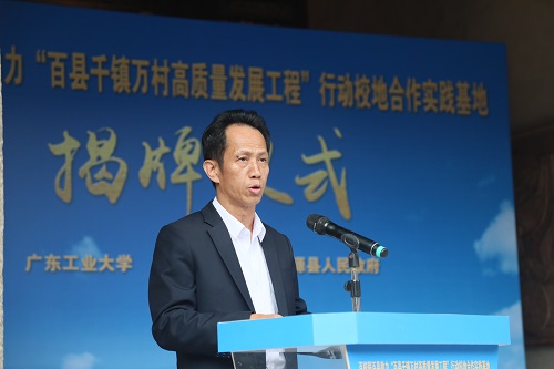 12月9日,东源县、广东工业大学与学校三方共建的“双百行动”校地合作实践基地揭牌仪式在东源县仙塘镇红光村举行,深入贯彻落实习近平总书记视察广东重要讲话、重要指示精神,推动百校联百县助力“百县千镇万村高质量发展工程”行动(以下简称“双百行动”)打开新局面。广东工业大学党委书记胡钦太,学校党委副书记谢锦群,河源市委副书记吴青川、副市长谢春艳,东源县委书记秦卫民,县长刘大荣出席仪式并为基地揭牌。河源市委实施“百千万工程”第二指导组及东源县领导邓山、林俊超、邹元清、张松新、陈飞燕,两所高校、市县有关部门负责同志,广东工业大学及学校驻东源服务队成员等出席仪式。仪式由县长刘大荣主持。