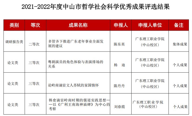 近日,2021-2022年度中山市哲学社会科学优秀成果评选结果公布。其中,学校教授陈东英团队的咨询报告《多管齐下推进广东老年事业全面发展的建议》获二等奖,副教授杨迪的论文《粤剧演员的角色体验与表演排场的关系》、陈丹丹的论文《论岭南谪宦文人苏轼的家国情怀》、刘春霞的论文《韩愈谪宦岭南时期的儒道实践思想——以〈广利王南海神庙碑〉为中心的考察》均获三等奖。