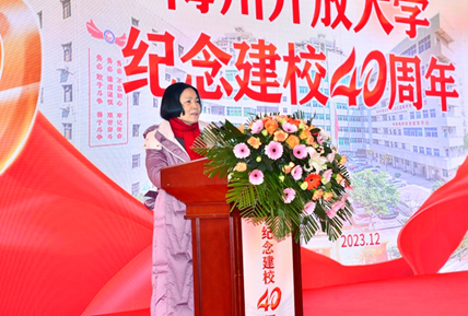 王宜奋代表省校对梅州开放大学体系近年的显著办学成效给予充分肯定,对梅州开放大学建校40周年表示祝贺。她指出,广东的开放教育事业与改革开放同行,梅州开放大学是广东开放大学体系中的重要组成部分。40年来,梅州开放大学历届领导班子与教职员工坚守初心使命,充分发挥体系办学凝聚力和向心力,主动作为,勇于开拓,务实创新,成果丰硕,已成为当地终身教育体系和学习型社会建设的重要力量,是广东终身教育大枢纽不可或缺的一环。她强调,梅州开放大学体系要坚持以习近平新时代中国特色社会主义思想为指导,不忘立德树人初心,牢记为党育人、为国育才使命,深刻把握党的二十大作出的教育强国战略部署。要以建校40周年为契机,在总结办学经验的基础上,准确把握新的发展阶段特征,谋划好未来发展。要聚焦服务全民终身学习,凝聚办学体系合力,守正创新谋发展,强化内涵提质量,奋力开创开放教育高质量发展新局面,为构建人人皆可成才、人人尽展其才的良好教育生态和建设“人人皆学、处处能学、时时可学”的学习型社会作出新的更大贡献。