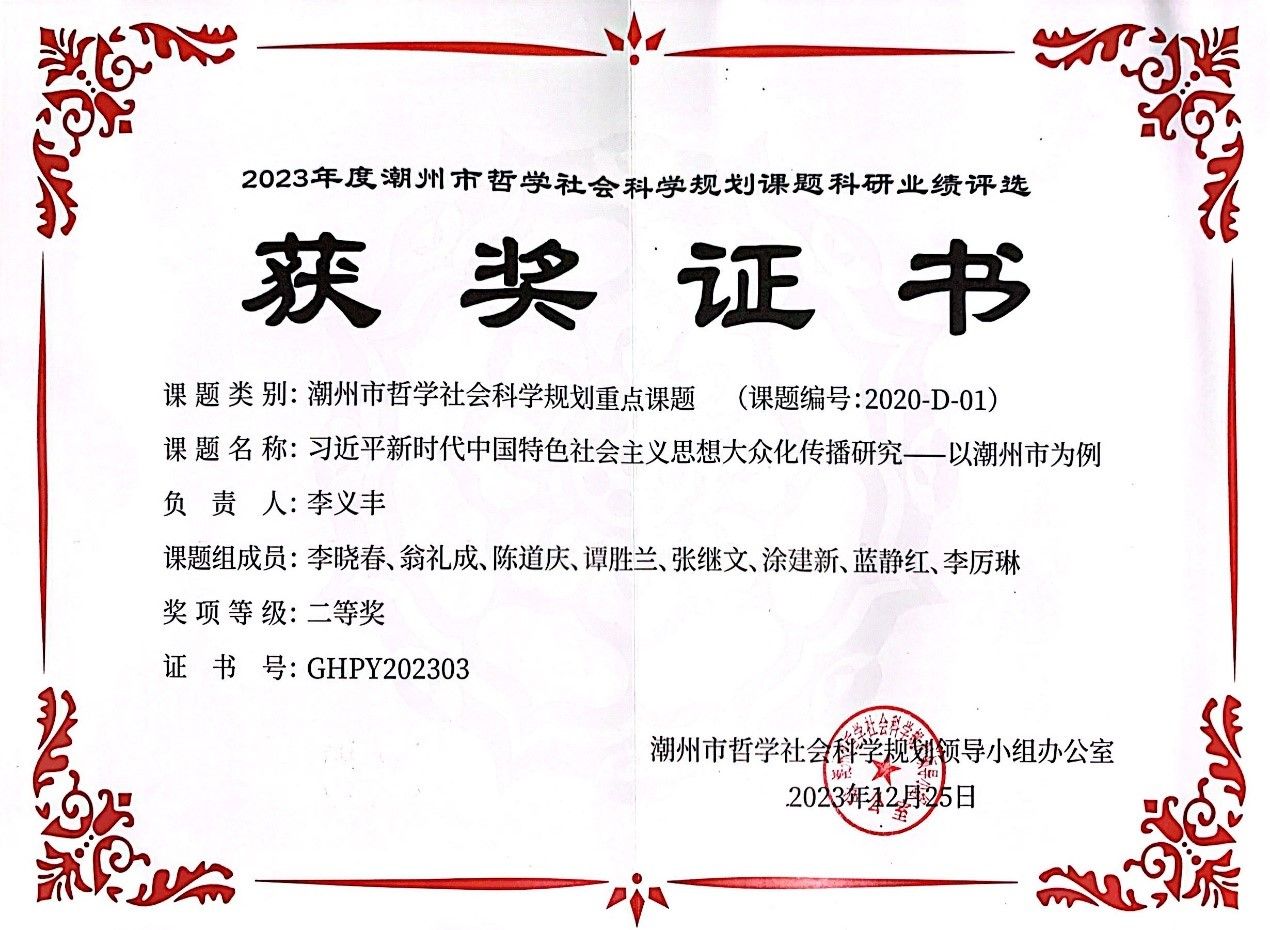 12月25日,在首届潮州市哲学社会科学规划课题成果奖励暨成果推介会上,学校马克思主义学院院长李义丰主持的潮州市哲学社会科学规划重点课题《习近平新时代中国特色社会主义思想大众化传播研究——以潮州为例》获二等奖。