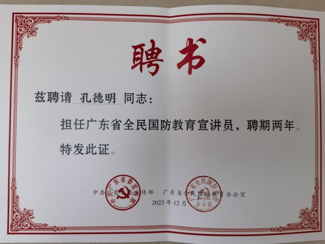 近日,省委宣传部和省全民国防教育办公室公布“广东省全民国防教育宣讲员”名单,学校马克思主义学院教师孔德明获聘省全民国防教育宣讲员。