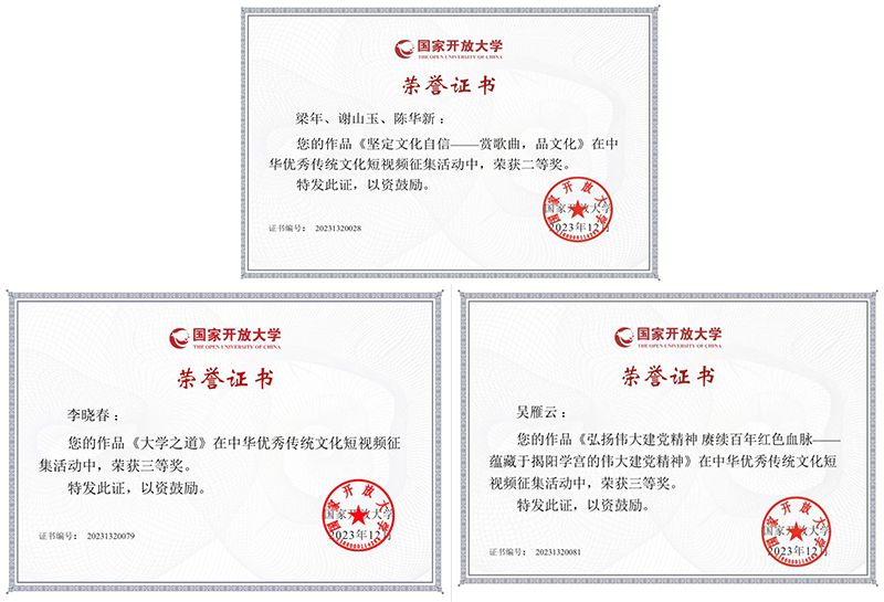 近日,国家开放大学公布中华优秀传统文化短视频征集活动评选结果。其中,佛山开放大学教师梁年、谢山玉、陈华新的作品《坚定文化自信——赏歌曲,品文化》获二等奖,省校马克思主义学院教师李晓春的作品《大学之道》、揭阳开放大学教师吴雁云的作品《弘扬伟大建党精神 赓续百年红色血脉——蕴藏于揭阳学宫的伟大建党精神》均获三等奖。