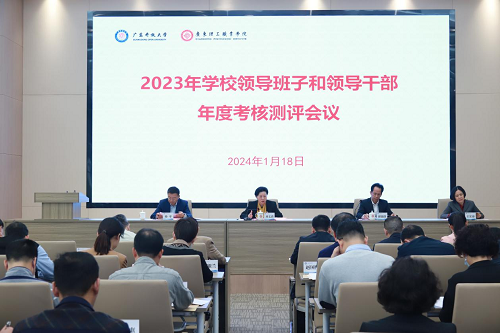 1月18日,学校领导班子和领导干部2023年度考核测评会议在广州校本部召开。党委副书记、校长刘文清主持会议并代表领导班子作年度工作述职报告。校党委副书记谢锦群,副校长孙平、王宜奋出席会议。全体校领导作个人年度工作书面述职报告。全体中层干部、教职工代表共83人参加会议,认真听取和审阅述职报告并进行了民主测评和评议。