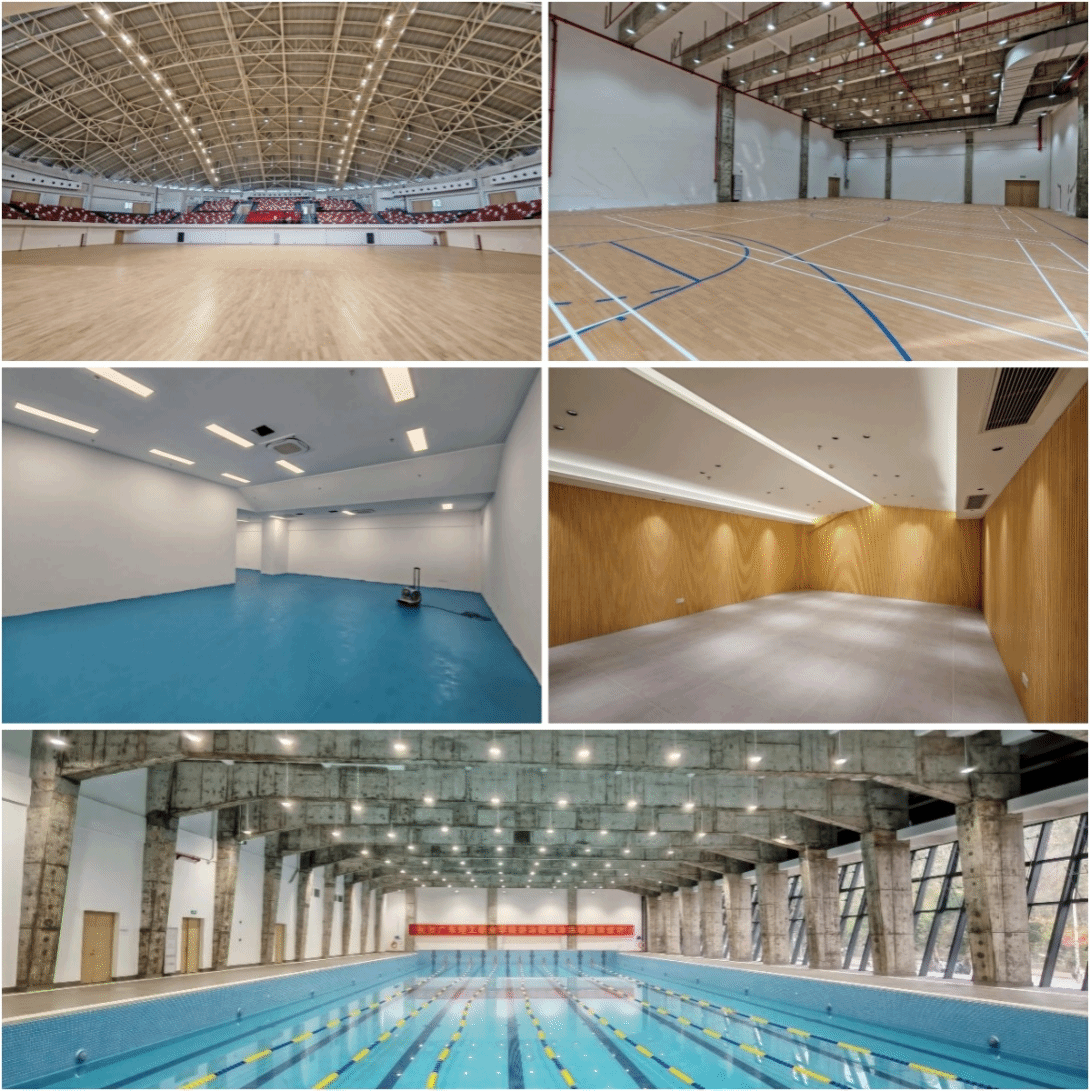 体育馆由主馆、副馆、游泳馆和配套功能用房组成,总建筑面积12542.13平方米。其中,主馆设有大型篮球场、舞台和看台,观众席最多可同时容纳4000多人;副馆设有篮球和羽毛球训练馆、武术室、乒乓球室等运动场地;功能用房包括接待室、管理室等。