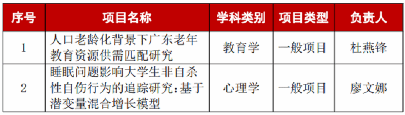 近日,省哲学社会科学规划2024年度常规项目、三类研究专项立项名单公布。其中,学校获一般项目立项2项,分别是科学技术部杜燕锋申报的《人口老龄化背景下广东老年教育资源供需匹配研究》和公共课教学部廖文娜申报的《睡眠问题影响大学生非自杀性自伤行为的追踪研究:基于潜变量混合增长模型》。