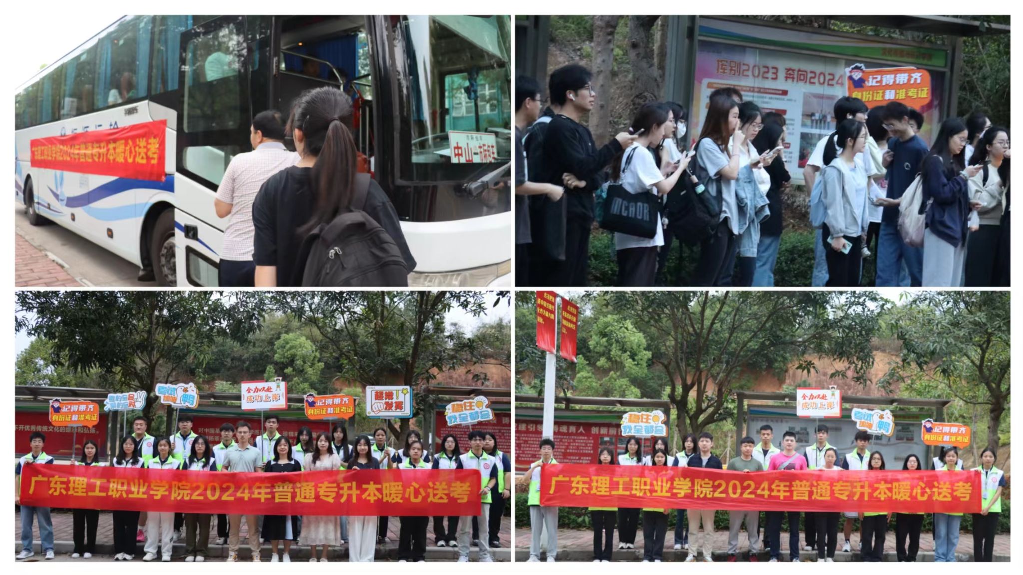 3月30日和31日的清晨6点,学校立德广场旁的校道边热闹非凡。9辆送考专车整装待发,准备将中山校区参加2024年普通高等学校专升本考试的学子们送往各考场参加考试,志愿者们手举标语给学长学姐们加油,引导考生们到指定车辆就坐,老师们一边组织考生们上车,还不忘给每位考生送出鼓励和祝福。31日下午13时,随着大巴车将最后一车考生送回到学校,2024年普通专升本考试“暖心送考”工作圆满落下帷幕。