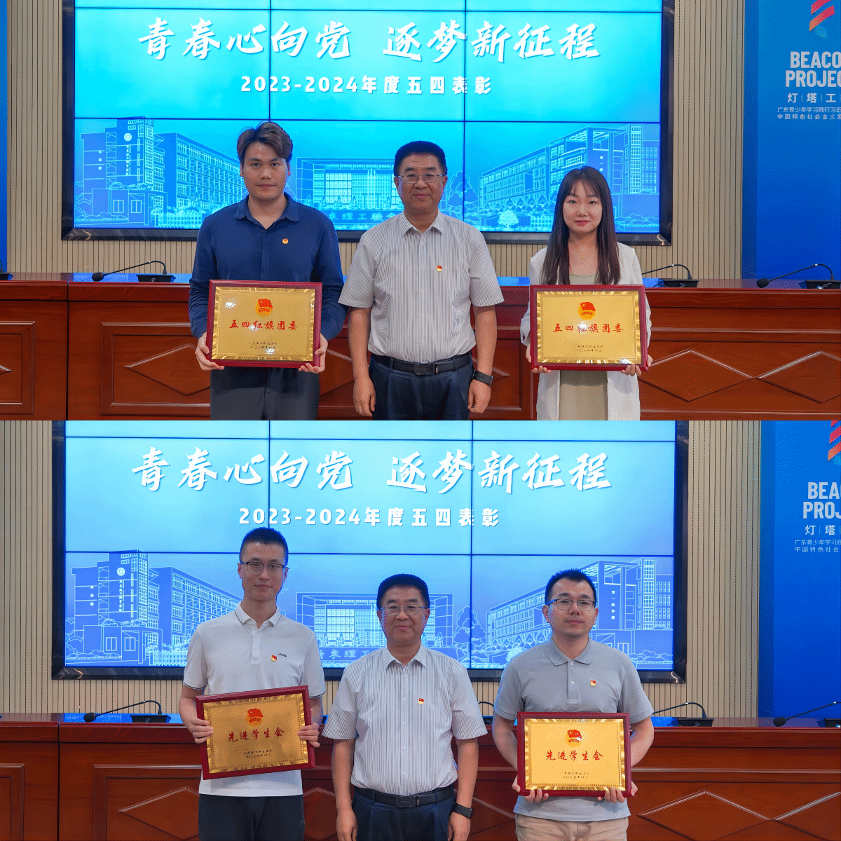 宋波向受到表彰的先进集体和个人表示热烈祝贺。他指出,青年师生作为与新时代同向同行的突击队和生力军,要握稳时代接力棒,在新征程的赛道上踔厉奋发、勇毅前行。一要夯“敢教日月换新天”的厚实底气,做五四精神的传承者。高扬爱国主义旗帜,自觉树立和践行社会主义核心价值观,坚定理想信念,躬身为民、实干担当,在人生道路上走得更正、行得更远。二要立“欲与天公试比高”的豪迈志气,做勤奋坚韧的耕耘者。当前正是学习的黄金时期,要勤奋求索、迈稳步子、夯实根基、久久为功,让勤奋学习成为青春远航的动力,努力成为坚定可靠、堪当重任的青年马克思主义者。三要铸“千磨万击还坚劲”的傲然骨气,做起而行之的行动者。始终保持“初生牛犊不怕虎”的闯头,保持抓铁有痕、踏石留印的劲头,将求知与实践相结合、探索与创新相统一。