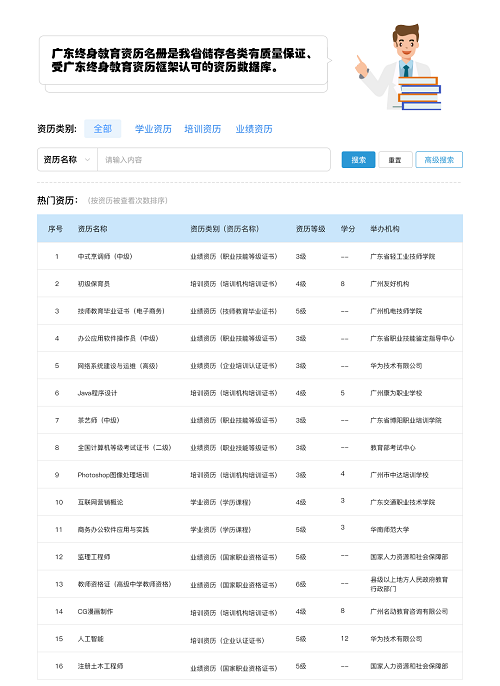 中心建设了广东终身教育资历名册,它以资历框架为内在逻辑,以资历等级为评价依据,构建知识学业、技能培训、岗位能力等各类资历相互衔接的终身学习“立交桥”,是服务全民终身学习的大平台,是助推教育培训机构提供有质量教育的重要举措,是用人单位岗位聘任和人才评价的重要依据,突显了职业教育的类型定位,打造了以能力为导向的人才评价机制。