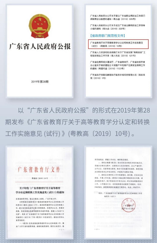 2019年10月,中心推动出台《广东省教育厅关于广东高等教育学分认定和转换工作实施意见(试行)》,建立了广东省学分认定和转换制度,为境内外高等学校本专科之间、高等教育自学考试及非学历学习成果的学分认定和转换提供了具体依据,是我省推进高等教育学分认定和转换工作,服务广大学习者的重要举措。