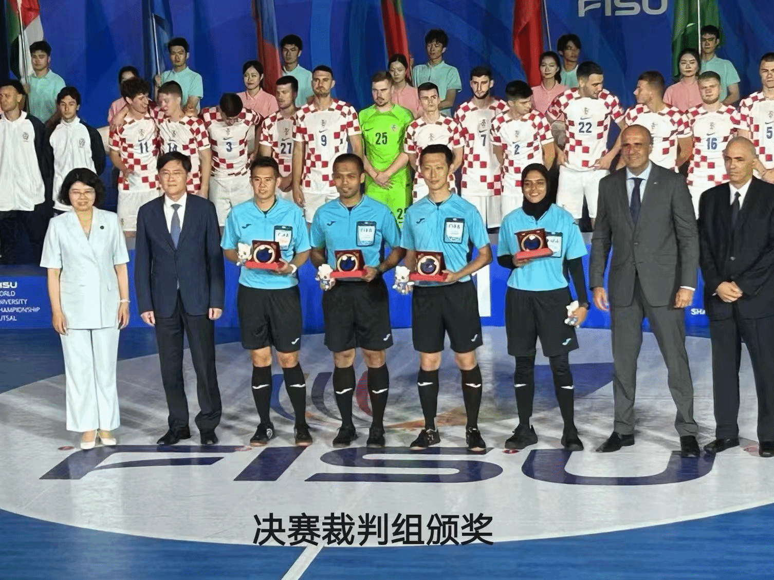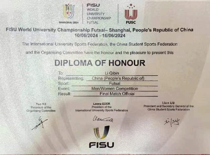 近日,为期10天的2024年世界大学生五人制足球锦标赛在上海举办。学校公共课教学部体育老师黎祺彬经国际大学生体育联合会严格选拔,作为执法裁判员全程执裁本次赛事,并以其专业、严谨、公正的表现获评“优秀裁判员”。
