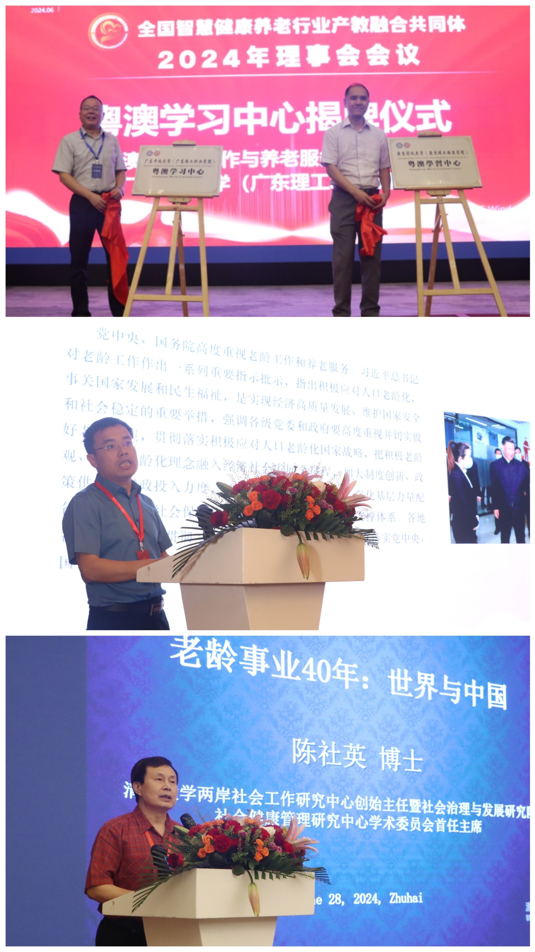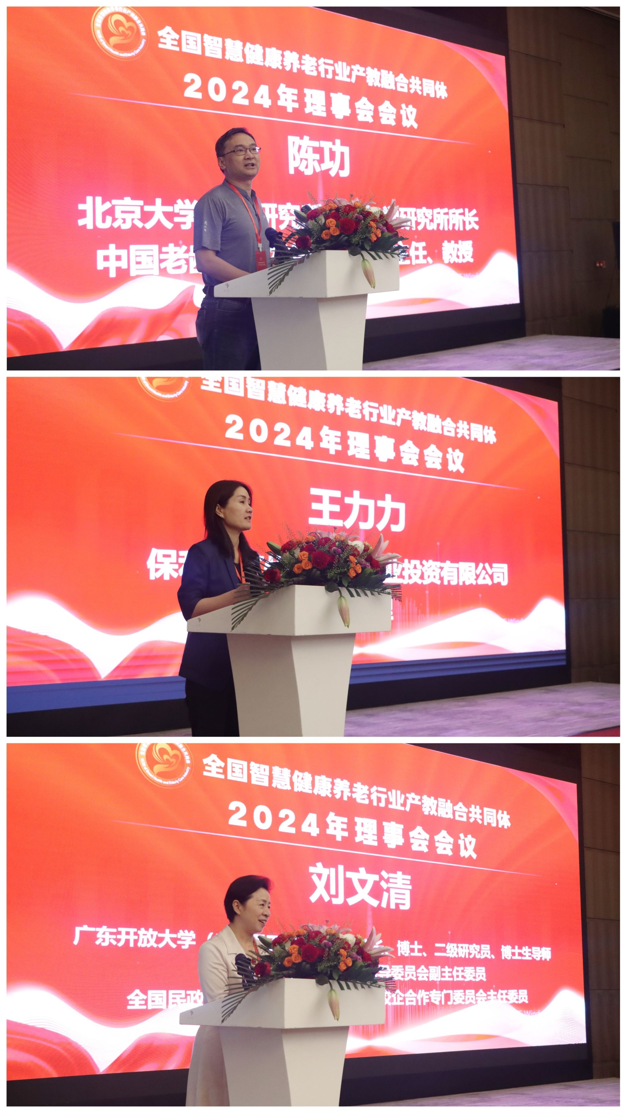 北京大学人口研究所、老年学研究所所长、中国老龄事业发展研究中心主任陈功,全国民政行指委副主任委员、校企合作专委会主任委员,广东开放大学(广东理工职业学院)党委副书记、校长刘文清,保利(广州)健康产业投资有限公司总经理王力力出席会议并分别代表共同体牵头单位致辞。