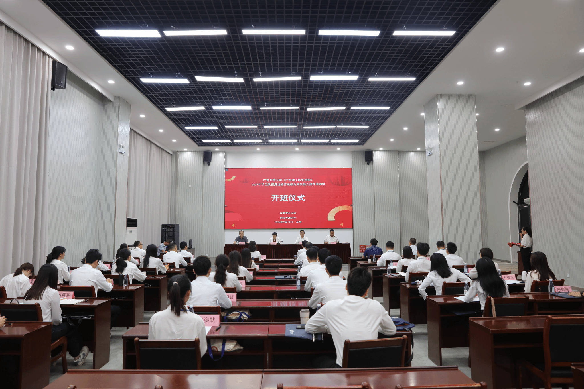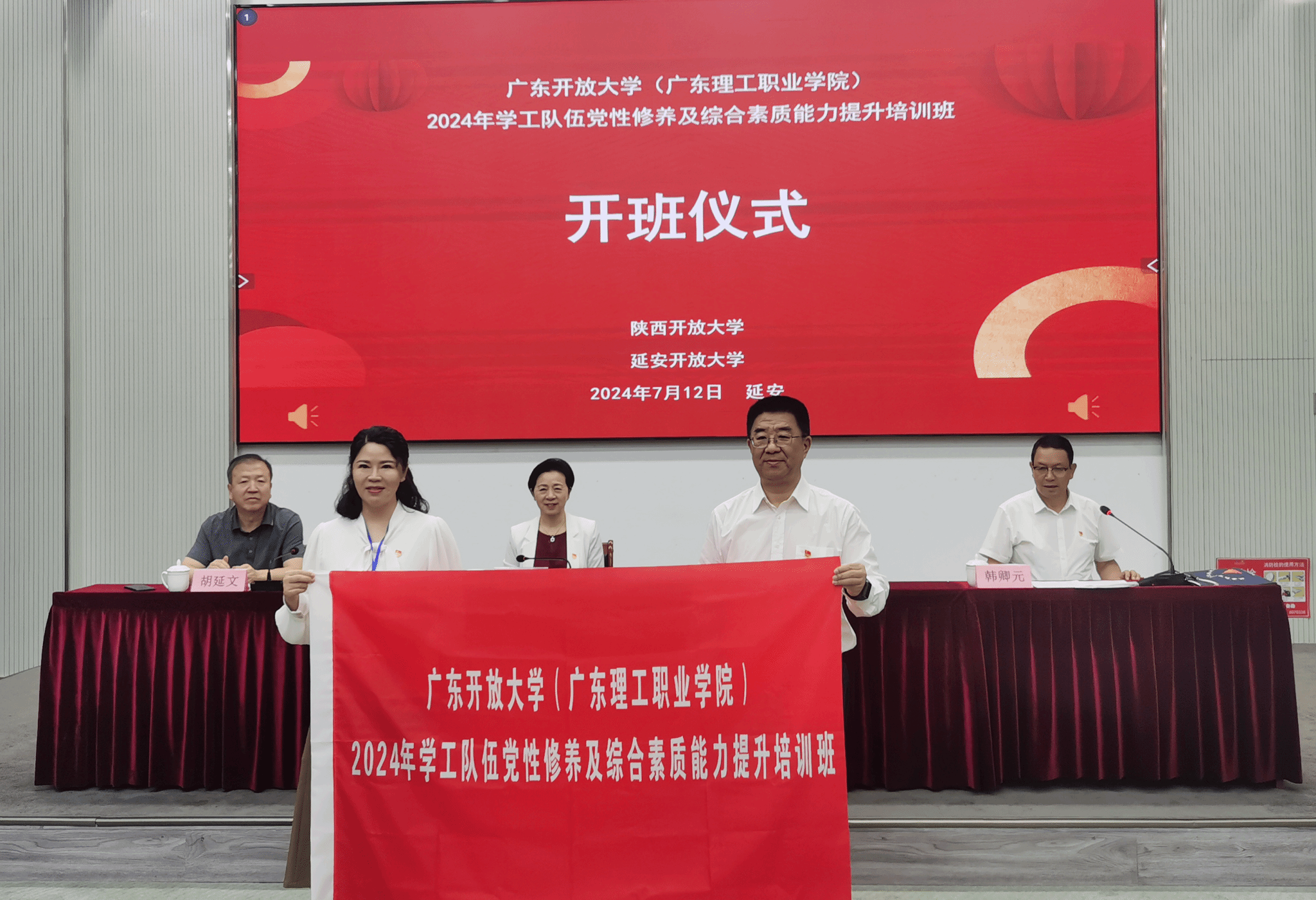 7月12日,学校学工队伍2024年党性修养及综合素质能力提升培训班在延安开班。学校党委副书记、校长刘文清出席开班式并讲话。学校副校长宋波出席开班式并向培训班授旗。陕西开放大学延安思政基地校长韩卿元主持开班式。延安开放大学校长胡延文致欢迎辞。