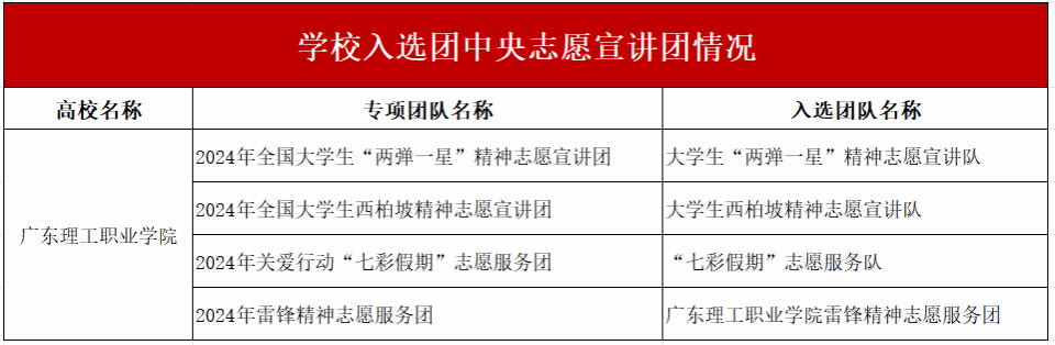 近日,团中央青年志愿者行动指导中心公布全国大学生志愿团入选团队名单。其中,学校团委指导的大学生“两弹一星”精神志愿宣讲团、大学生西柏坡精神志愿宣讲团、“七彩假期”志愿服务队等3支队伍先后入选团中央专项志愿服务团队;另外,学校学生团队入选雷锋精神志愿服务团,成为入选的10所广东高校团队之一。
