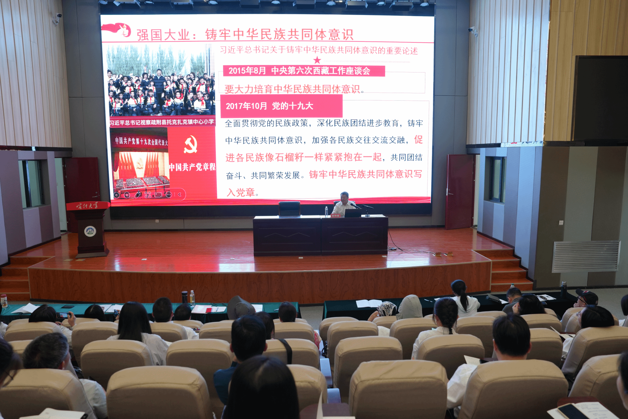 南开大学马克思主义学院原院长、博士生导师、喀什大学马克思主义学院银龄教授赵铁锁作题为《百年党史视域下的中华民族共同体意识》的专题报告,从救国大业、兴国大业、富国大业和强国大业四个方面出发,阐释了中国共产党强大的凝聚力在民族工作中的作用,使我们党彻底结束了旧中国一盘散沙的局面,团结带领全国各族人民缔结成了你中有我、我中有你、谁也离不开谁的中华民族共同体。通过梳理党的十八大到党的二十大习近平总书记关于中华民族共同体意识的重要论述,我们更应该更深刻地认识到,铸牢中华民族共同体意识,是新时代民族工作的鲜明主线,是我们党治国理政的重大原则,已经成为全党全国各民族人民实现第二个百年奋斗目标新征程上的共同意志和根本遵循。