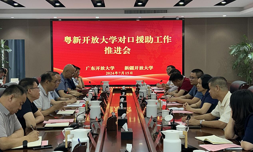 7月15日,粤新开放大学对口援助工作推进会在乌鲁木齐召开,任务是总结对口援助工作经验做法,部署推动下一阶段工作。受广东开放大学党委副书记、校长刘文清委托,副校长王宜奋出席会议,与新疆开放大学校长安瓦尔·买买提明进行了工作交流。新疆开放大学副校长崔军主持会议。两校相关部门负责同志及两省区开放大学体系第二批对口援助单位负责同志参会。