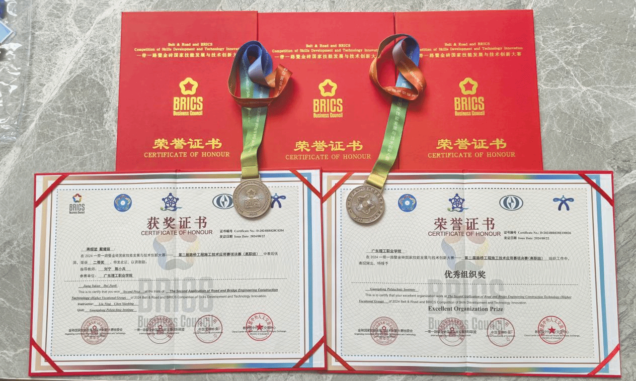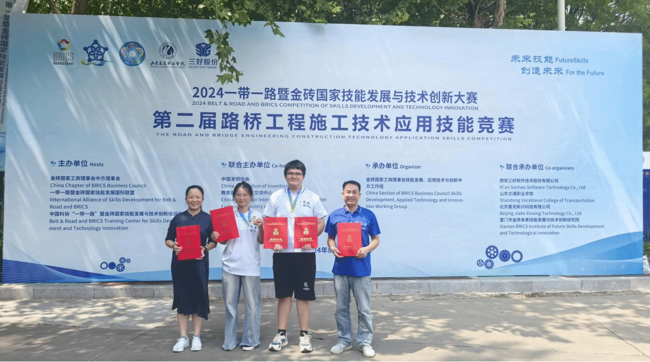 8月20日至22日,2024“一带一路”暨金砖国家技能发展与技术创新大赛第二届路桥工程施工技术应用赛项全国总决赛暨金砖大赛南非国际选拔赛在山东潍坊举办。经过激烈角逐,学校工程技术学院学生蒋煜堃、戴健丽在282支参赛队伍中脱颖而出,荣获高职组二等奖(银牌),教师刘宁、陈小兵荣获优秀指导教师,学校被授予“优秀组织奖”。