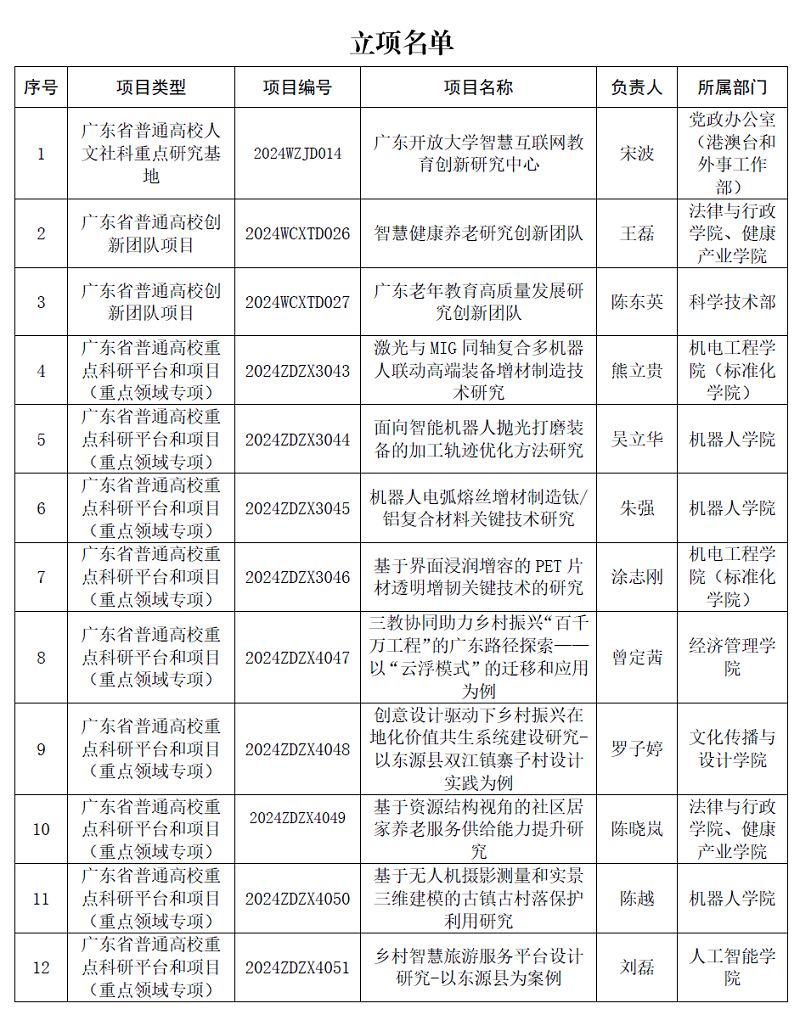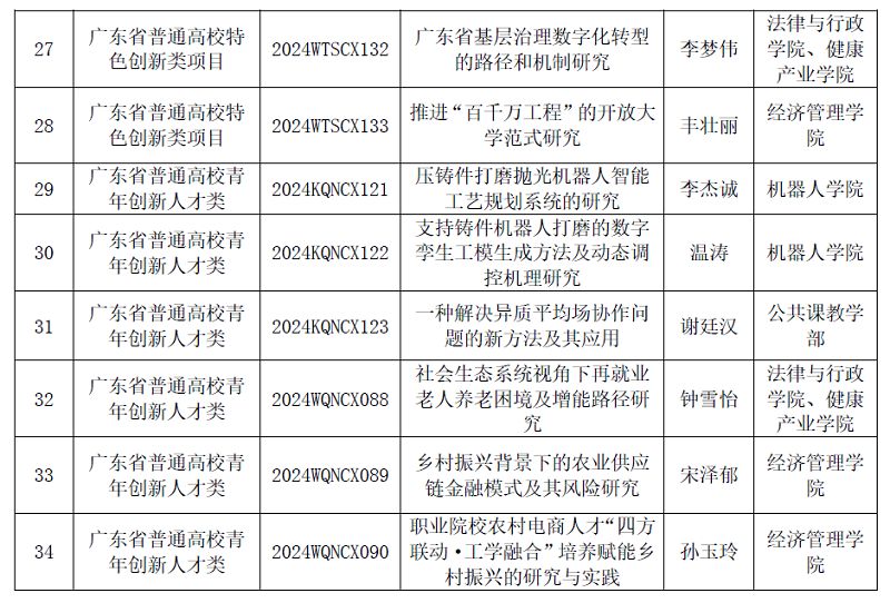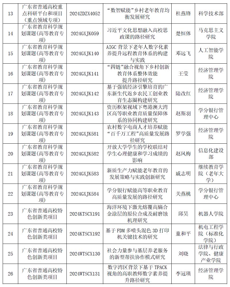 近日,广东省教育厅公布2024年度普通高校重点科研平台和项目立项名单、2024年度普通高校认定类科研项目立项名单,广东省教育科学规划领导小组办公室公布2024年度教育科学规划课题(高等教育专项)立项名单。其中,学校共有34个项目获得立项,包括人文社科重点研究基地1项、创新团队项目2项、重点领域专项10项、教育科学规划课题9项、认定类项目12项。