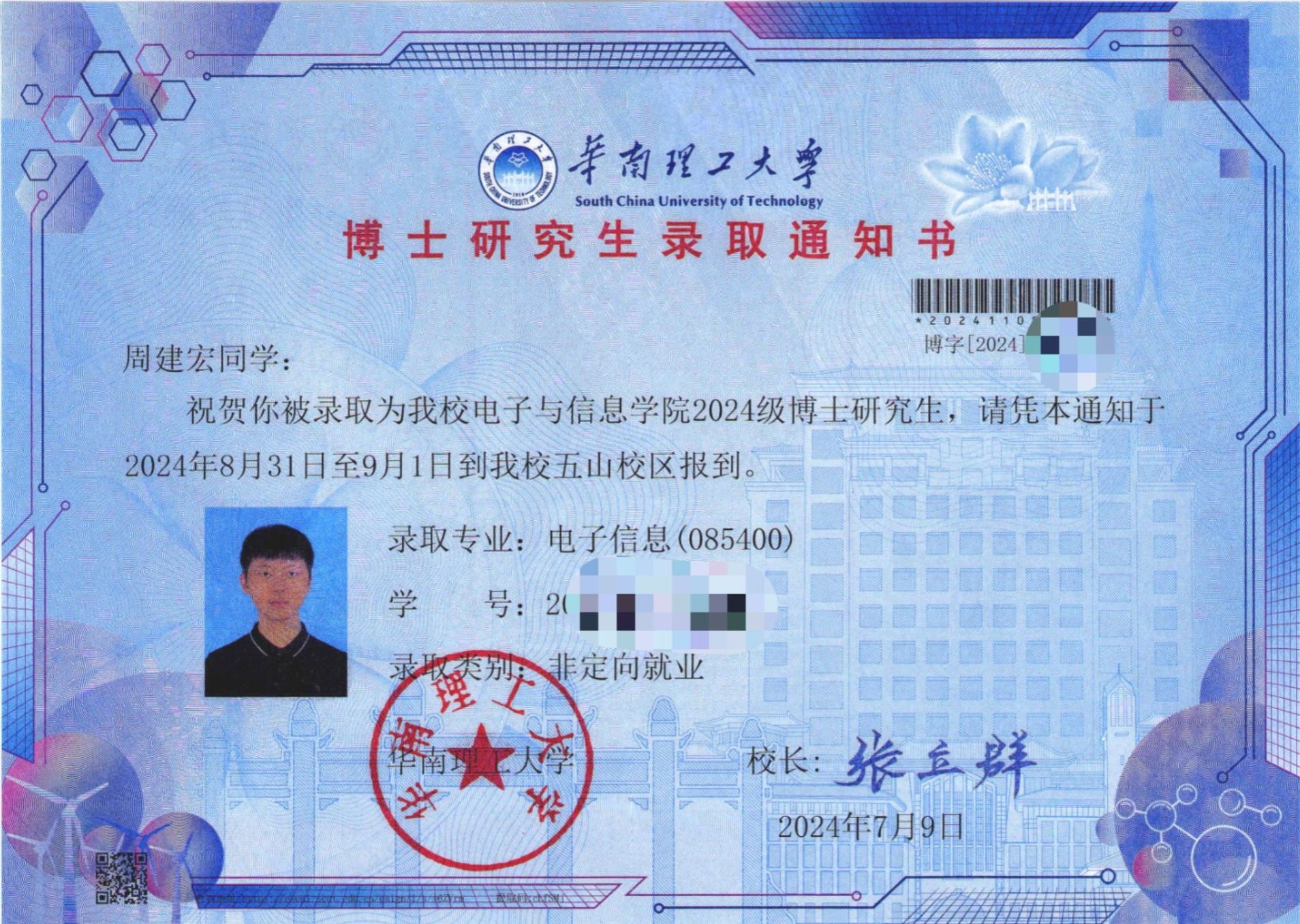 近期,学校人工智能学院2018届高职毕业生周建宏考取华南理工大学2024级电子信息专业博士研究生。
