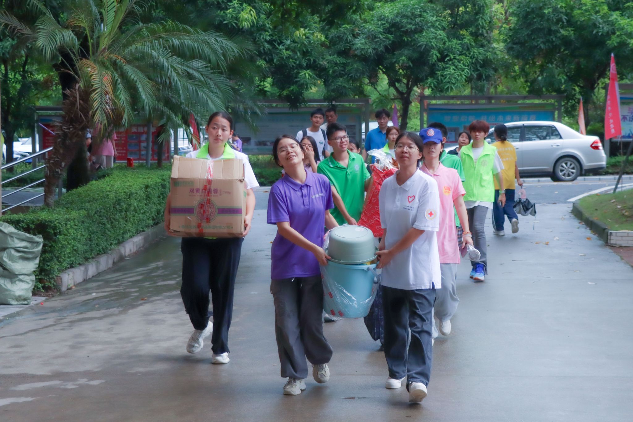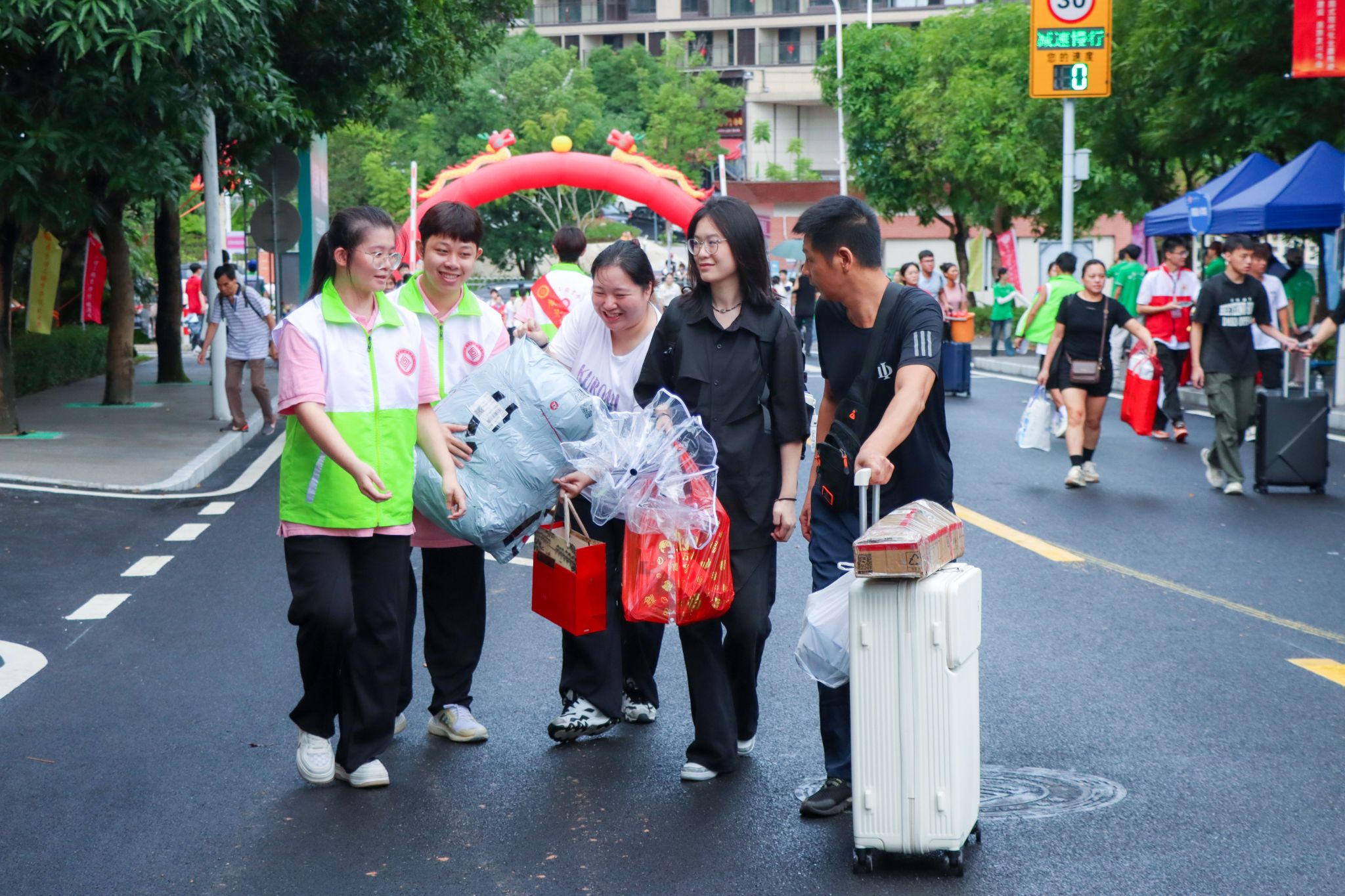 帮忙搬运行李、指引路线、解答咨询……9月8日,一支由各级团学组织和社团骨干等组成的规模达2000多人的迎新志愿者队伍活跃在学校2024年迎新现场,助力新生和亲友报到无忧。