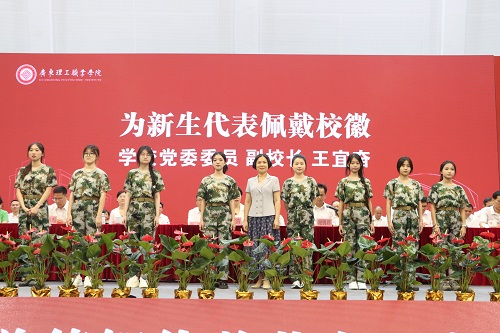 王宜奋、宋波为新生代表佩戴校徽,勉励全体新生以校为荣,以学校学生身份严格要求自己,努力为校增光添彩。