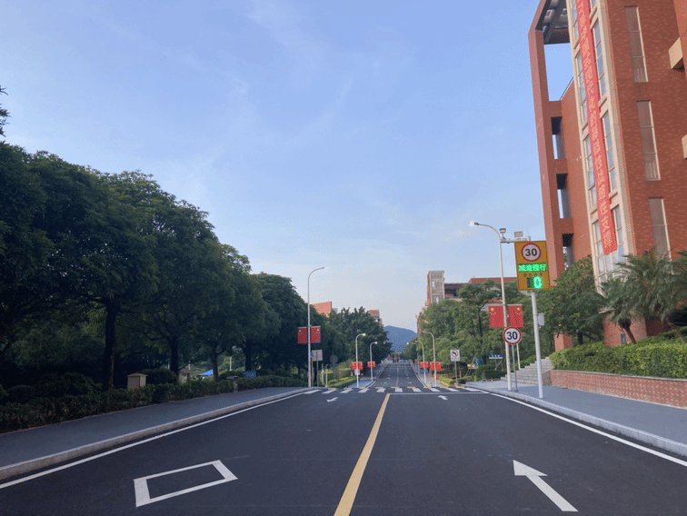 这次改造路段自学校南门起,经教师公寓、实训楼、教学楼、体育馆、食堂、西门、学生宿舍区至13号学生宿舍楼止,全长约2公里,路面施工范围宽7-10米。改造前为路龄已达16年的破旧混凝土路面,通行体验欠佳,改造需求迫切。改造设计和施工遵循因地制宜、合理选材、方便施工、利于养护的综合原则,行车道采用高标准沥青,人行道新面层采用防滑、耐用、低噪音、透水的灰色混凝土,部分路段人行道移除路障,保障通行顺畅,人行道和路口连接处尽量采用缓坡设计,进一步提升了校园交通无障碍化和人车分离水平。