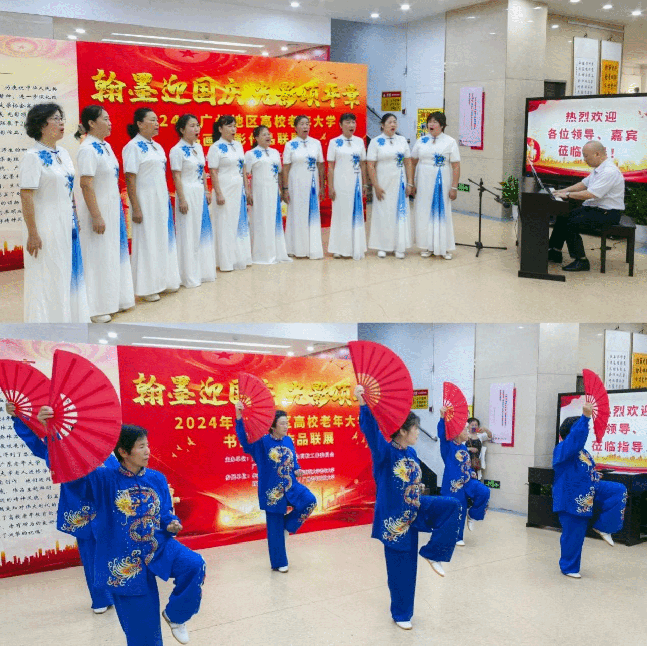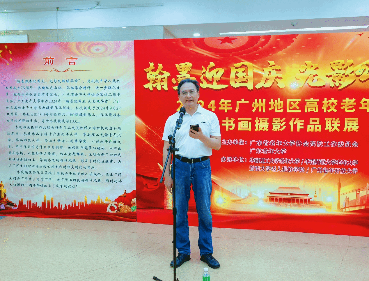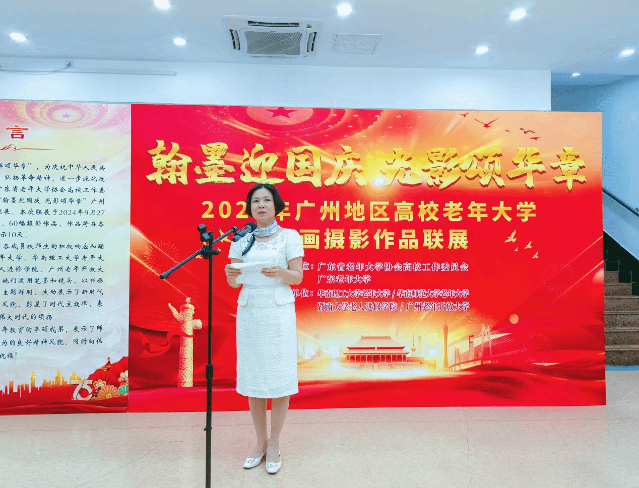 金秋送爽,硕果飘香。9月30日,省老年大学协会高校工作委员会各成员校联合举办的“翰墨飘香迎国庆,光影交织颂华章”——2024年广州地区高校老年大学书画摄影作品联展在广东老年大学拉开帷幕。学校党委委员、副校长,省老年大学协会高校工作委员会主任王宜奋出席开幕式并致辞,省老年大学协会副会长杨学威出席活动并讲话。华南理工大学老年大学、华南师范大学老年大学、暨南大学老人进修学院、广州老年开放大学、广东老年大学等成员校负责同志及师生代表出席开幕式。