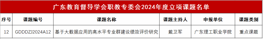 近日,省督导学会职业教育专业委员会2024年度立项课题名单发布。其中,学校人工智能学院教授戴卫军领衔申报的课题《基于大数据应用的高水平专业群建设绩效评价研究》获重点课题立项,这是该团队在高职教学改革重点领域——“双高”建设研究方面取得的又一阶段性业绩。