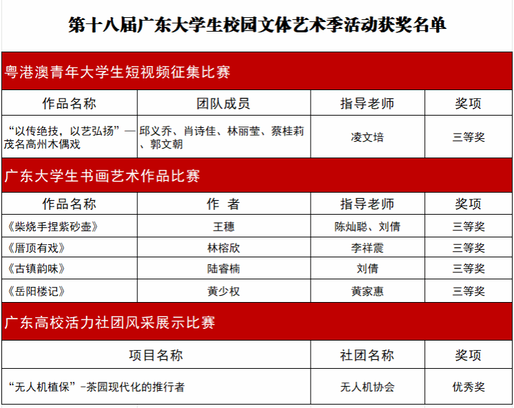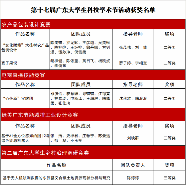 近日,在由团省委、省教育厅等单位联合主办的第十七届广东大学生科技学术季、第十八届广东大学生校园文体艺术季活动上,学校学子荣获省级荣誉11项,包括二等奖3项、三等奖7项、优秀奖1项。其中,3个获奖团队前往东源县村落以文化赋能“双百行动”出成果见成效。