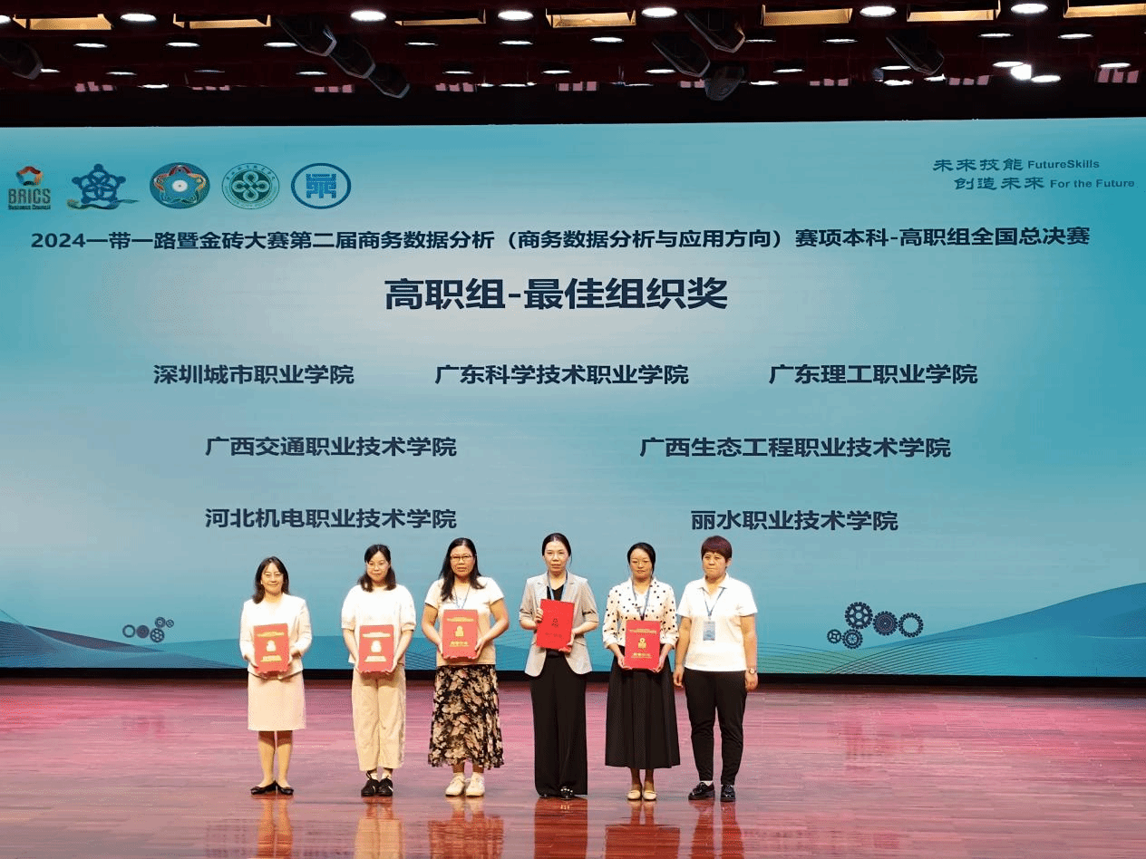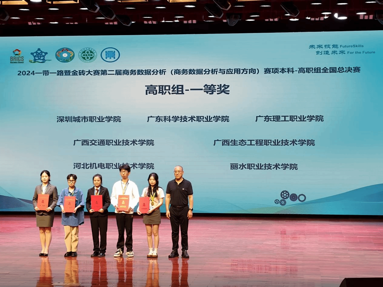 10月20日,在2024年“一带一路”暨金砖国家技能发展与技术创新大赛之第二届商务数据分析(商务数据分析与应用方向)赛项全国总决赛上,学校经济管理学院学生梁启业、朱文君、卢颖欣获高职组一等奖(金牌),教师赖文燕、游静获“优秀指导教师奖”,学校被授予“最佳组织奖”。