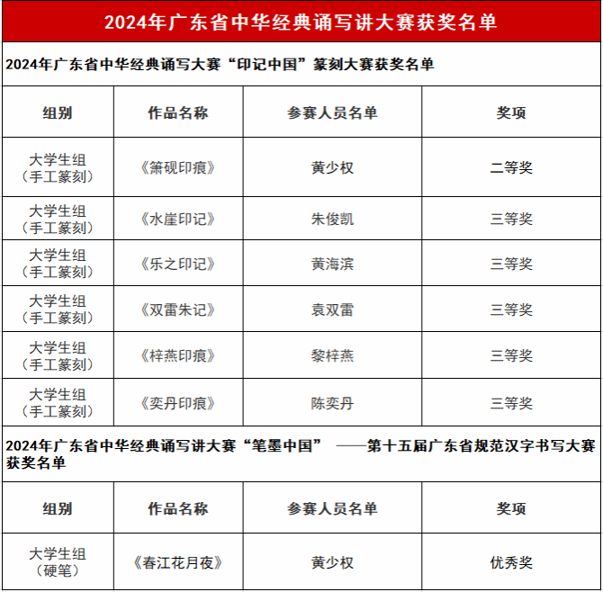 近日,省教育厅、省语言文字工作委员会公布2024年广东省中华经典诵写讲大赛之“笔墨中国”——第十五届广东省规范汉字书写大赛和“印记中国”篆刻大赛获奖名单。其中,学校选送的晨阳书法美术协会作品共获奖项7个。