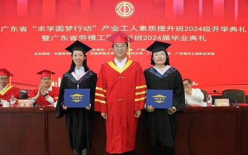 仪式上,毕业生代表、全国劳动模范、广东梅州科泓药业有限公司技术员黄国玉,新生代表、全国五一劳动奖章获得者、中国工会十八大代表、广州顺丰速运有限公司营业点主管邓兴斌分享了自己的学习收获和求学畅想。