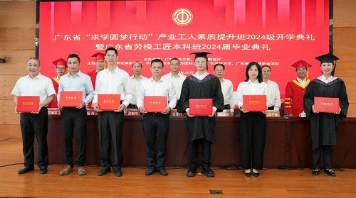 10月25日,省“求学圆梦行动”产业工人素质提升班2024级开学典礼暨省劳模工匠本科班2024届毕业典礼在广东工匠学院举行。学校2024届省劳模工匠本科班20名学员顺利毕业,2024级95名新生顺利入学。省人大常委会党组成员、省总工会主席吕业升,省总工会党组书记、常务副主席陈伟东出席活动并讲话,省总工会一级巡视员张振飚主持,省教育厅二级巡视员邵子铀致辞,学校党委委员、副校长宋波代表学校向2024届毕业生颁发毕业证书并向2024级新生作开学致辞。