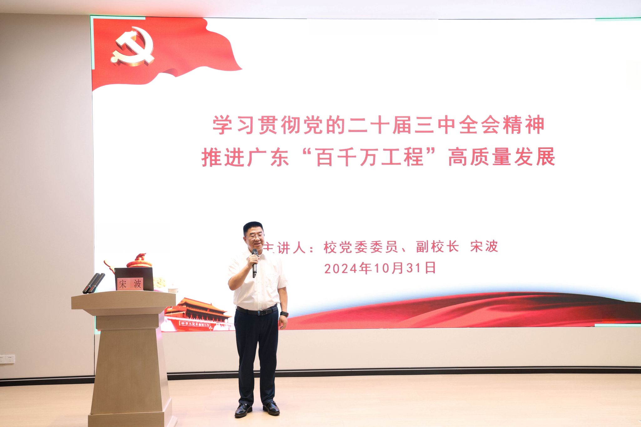10月31日,学校党委委员、副校长宋波以“学习贯彻党的二十届三中全会精神,推进广东‘百千万工程’高质量发展”为题,给机器人学院和工程技术学院学生讲授“思政第一课”。信息化建设部党支部全体党员旁听。