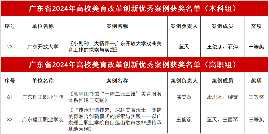 近日,省教育厅公布了2024年高校美育改革创新优秀案例评选结果。其中,学校教授蓝天团队报送的案例《小剧种、大情怀—广东开放大学戏曲美育工作的探索与实践》获本科组一等奖,教授潘美意团队报送的案例《高职图书馆“一体二元三维”美育服务体系构建与实践》和教师王俊彦团队报送的案例《“传承非遗技艺,深耕美育沃土”非遗美育融合创新模式的探索与实践——以广东理工职业学院白口莲山歌市级非遗传承基地为例》均获高职组三等奖。