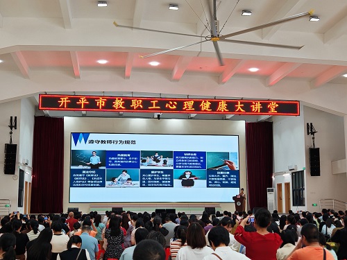 在开平市教职工心理健康大讲堂上,学校党委学生工作部心理咨询中心教授杨莲清以“做一名幸福教师——教师的压力管理与自我调适”为题,为全市500多名中小学教师作专题讲座。她从向往幸福、解码幸福、寻找幸福、体验幸福等四个方面为教师们身心赋能、释放压力,通过现场互动、示范等方式,引导教师们关注自己的心理健康,学会压力和情绪管理,以积极心态、饱满热情投身教育事业,做一名幸福教师。
