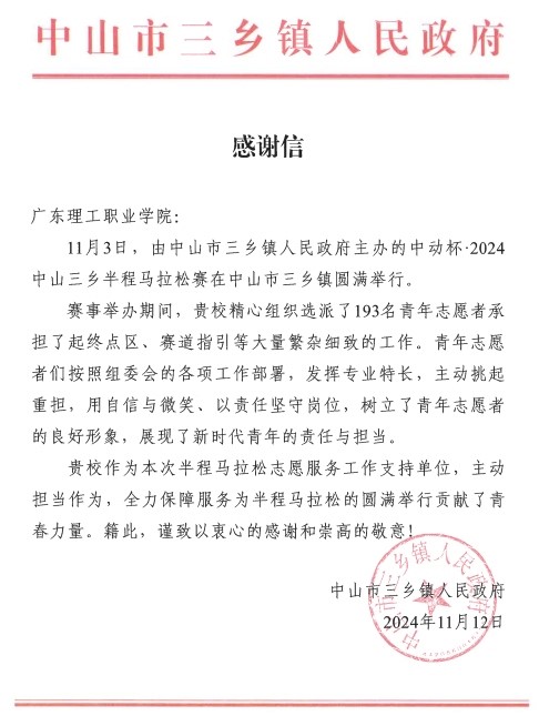 比赛当天,学生志愿者们凌晨4点出发奔赴服务现场,以专业的服务在志愿服务岗位上连续工作8个多小时。志愿者们不畏艰辛,勇担重任,用奉献、热情、团结与坚守确保了赛事各项工作顺利进行,圆满完成了组委会交予的各项志愿服务任务,受到中山半程马拉松赛参赛选手和组委会的肯定,并给学校发来感谢信。