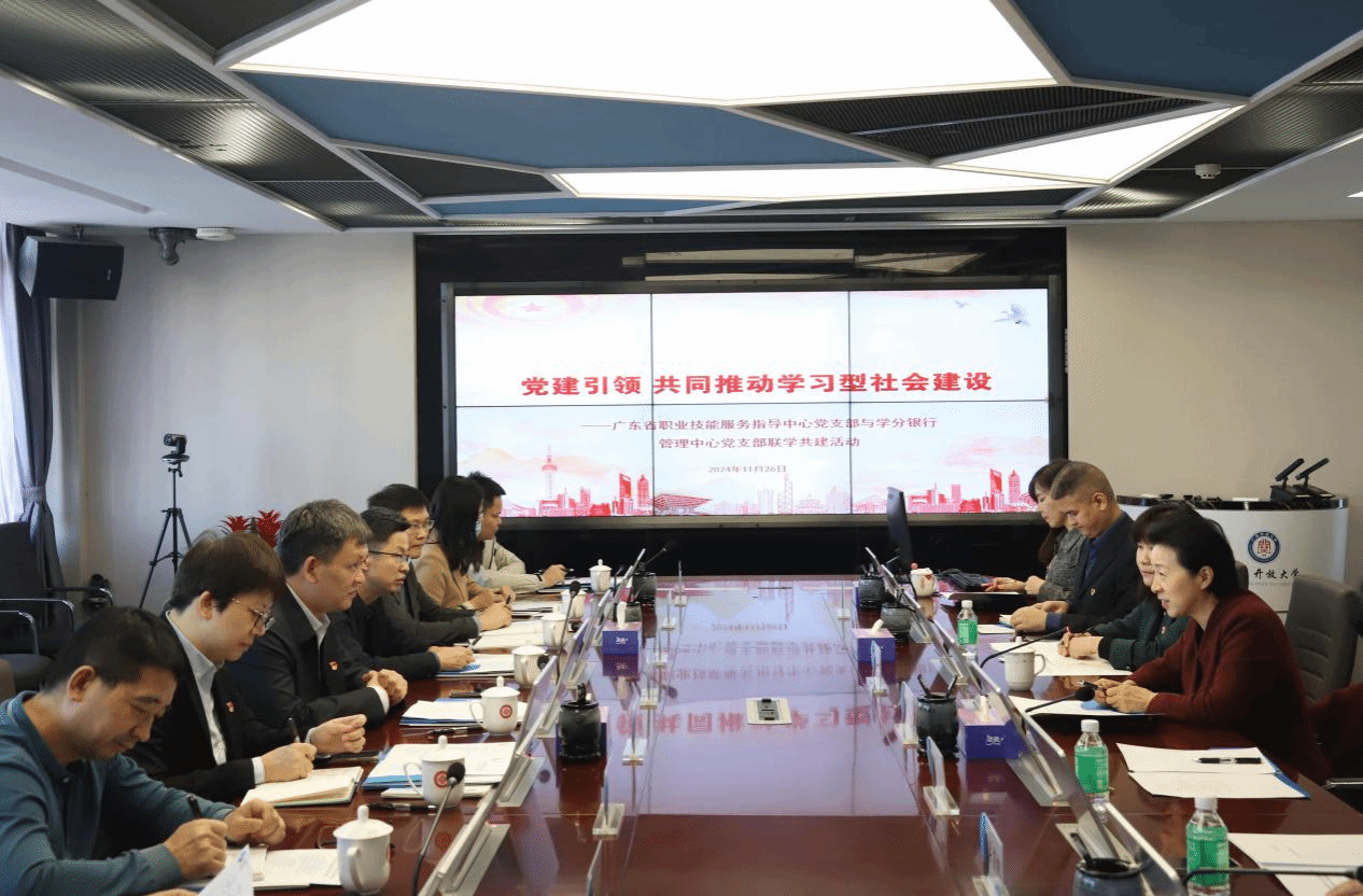 11月26日,省职业技能服务指导中心党支部来校,与广东终身教育学分银行(以下简称学分银行)管理中心党支部开展以“党建引领,共同推动学习型社会建设”为主题的联学共建活动,深入学习习近平总书记关于促进高质量充分就业的重要讲话精神,参观学分银行实体中心,就广东终身教育资历框架修订、学分银行数字化建设、成果评审试点以及学历证书与国家职业资格证书、职业技能等级证书间的双向比照和融通等学分银行建设重点工作进行了深入交流,一致认为要坚持党建引领,凝聚发展共识,加强协同联动,为推动我省学习型社会建设贡献更多力量。学校党委副书记、校长,学分银行管理委员会副主任刘文清,省职业技能服务指导中心主任叶磊出席活动并讲话。