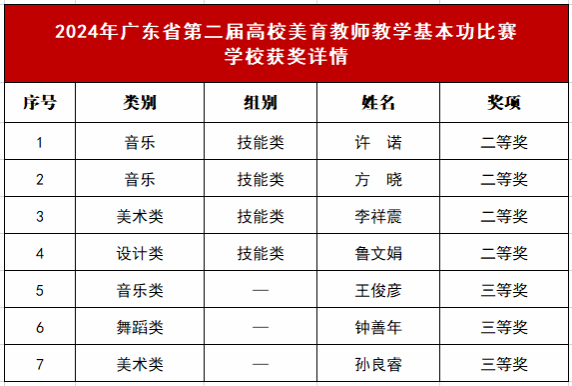 此前,学校教师还获全省第一届高校美育教师教学基本功比赛决赛一等奖、2024年高校美育改革创新优秀案例本科院校组一等奖和高职组三等奖。