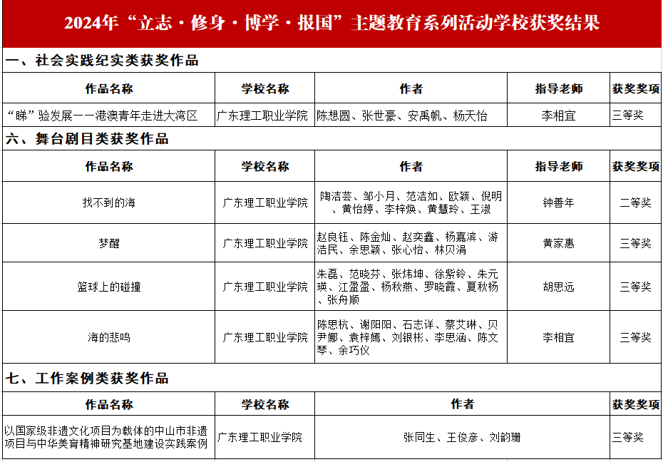 近日,省教育厅公布2024年“立志·修身·博学·报国”主题教育系列活动结果。其中,学校获奖6项,包括二等奖1项、三等奖5项。