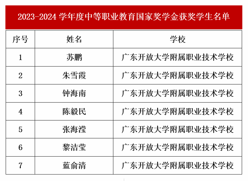 近日,教育部、人力资源和社会保障部公布2023—2024学年度中等职业教育国家奖学金获奖学生名单。其中,学校附属职校苏鹏等7名同学入选。