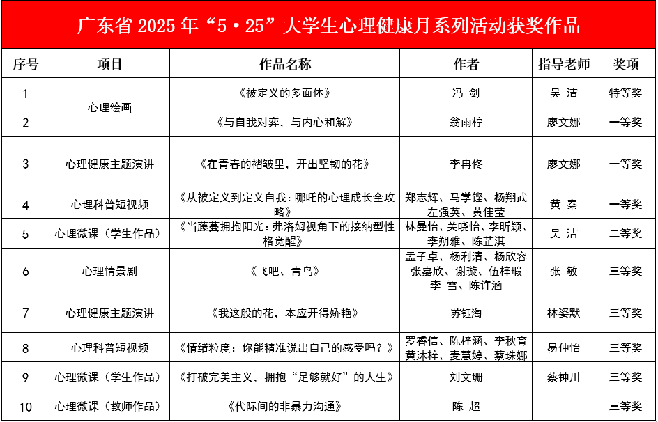近日,省教育厅公布2025年广东省“5·25”大学生心理健康月系列活动获奖结果。学校师生共斩获10个奖项,其中,特等奖1项、一等奖3项、二等奖1项、三等奖5项,获奖层次与数量均实现新突破。
