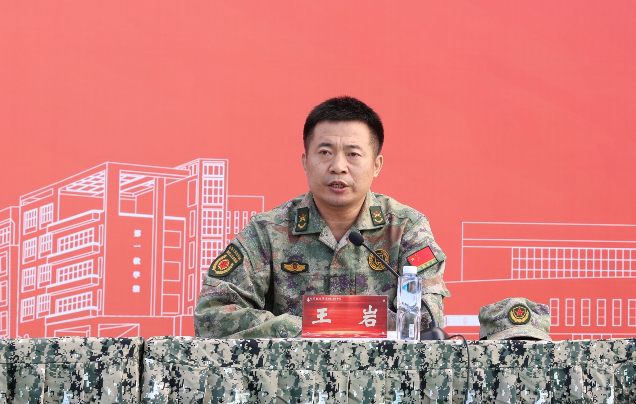 王岩在讲话中对带训教官提出纪律要求,勉励新生们以饱满的热情、昂扬的斗志、顽强的意志直面军训,以优异的军训成绩和良好的精神风貌交出满意答卷。