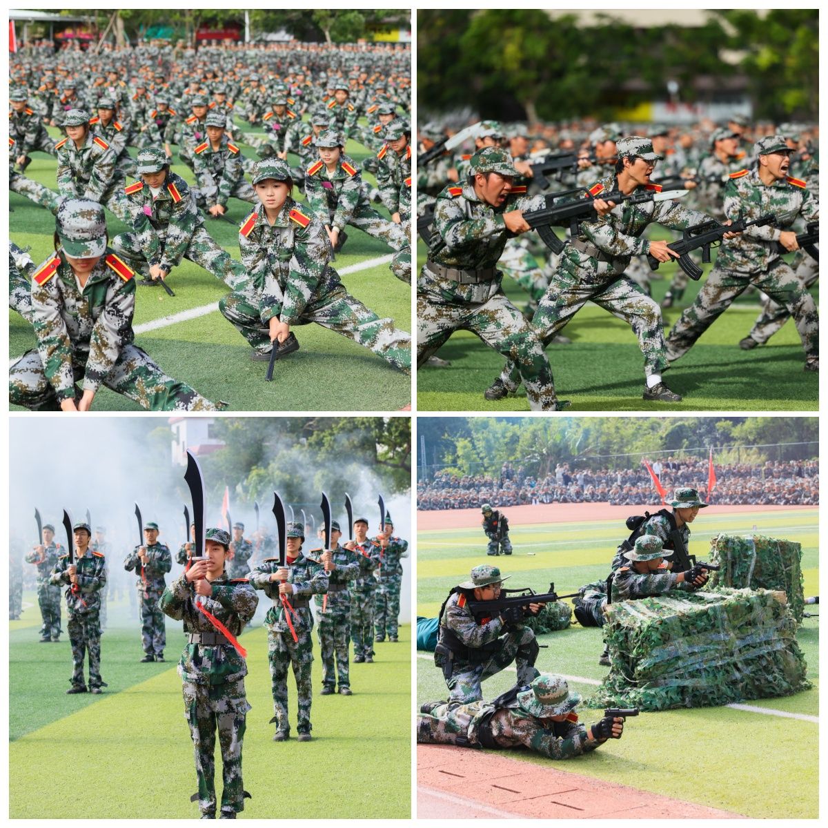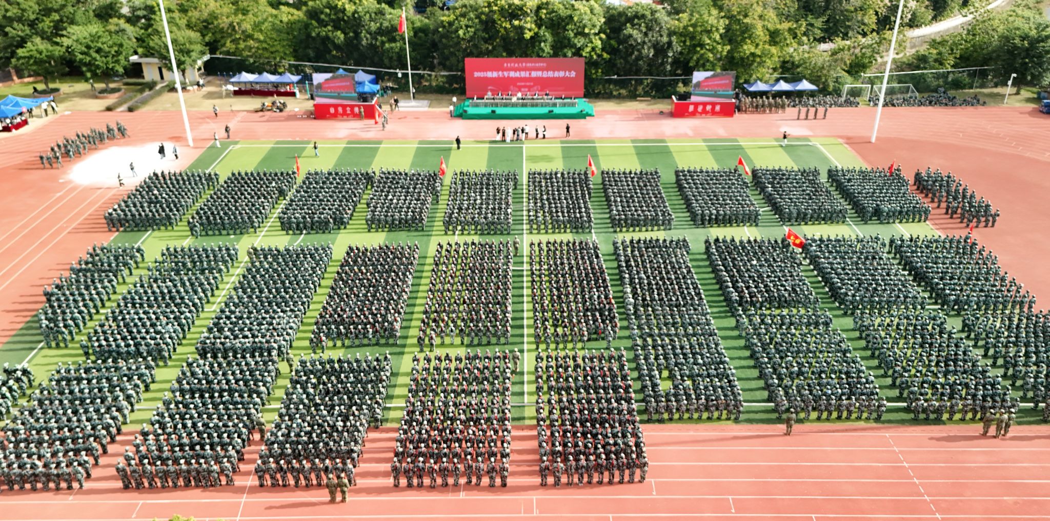 大会在庄严的升国旗仪式中拉开序幕。6400多名新生接受检阅,分别进行分列式、军体拳、盾牌操、刺杀操、短棍术、匕首操、大刀操、战术等军训成果展示,精神抖擞、步伐矫健、队列整齐、口号响亮,展现了对党忠诚、听党指挥的不变军魂和不怕牺牲、敢打必胜的精神内核。