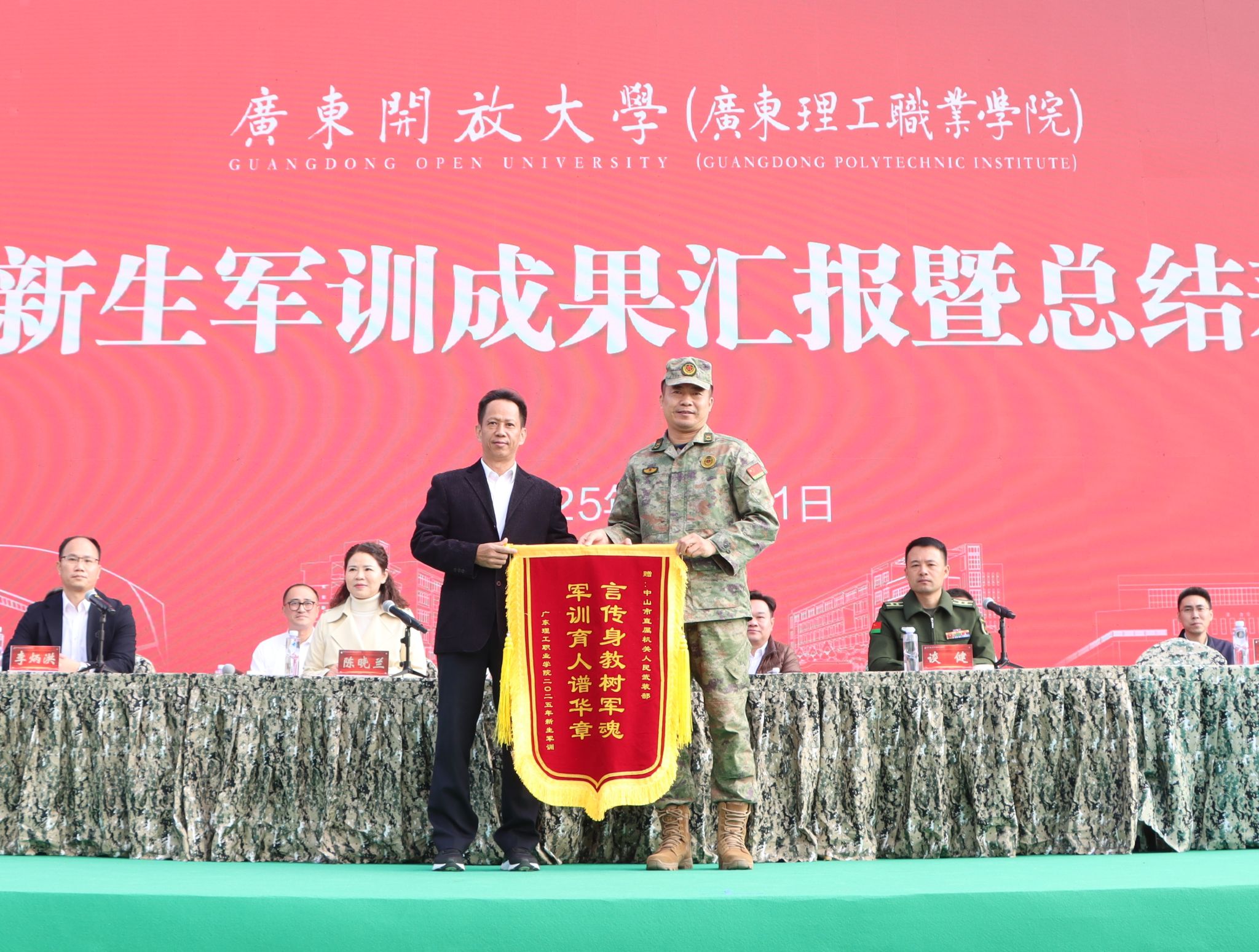 会上,谢锦群代表学校向中山市直属机关人民武装部赠送锦旗。大会宣读了表彰2025级新生军训先进集体和先进个人的决定,并向军训先进集体和个人颁奖。