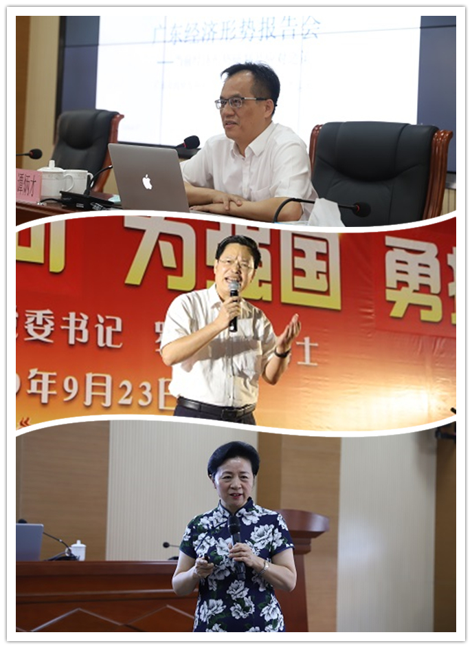 举办经济形势报告会,邀请省政府发展研究中心党组成员、副主任谭炳才研究员分析解读当前世界经济形势、中美贸易摩擦、粤港澳大湾区建设以及广东应对当前环境与变化之策,教育引导广大党员干部准确掌握当前经济形势政策,把思想和行动统一到中央和省委决策部署上来。学校党委书记、校长认真上好新学期“思政第一课”,紧密结合当前国内外经济社会发展形势,从师生思想实际出发,精心准备、设计主题和内容。罗海鸥书记以“守初心、求学问,为强国、勇担当”为题,勉励青年学生努力成为德智体美劳全面发展的社会主义建设者和接班人。刘文清校长通过对比分析当前国内外政治形势,向青年学生介绍新时代中国特色社会主义政治制度的优势,要求青年担当起新时代赋予的使命。